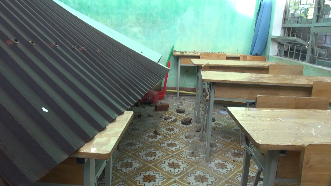 Theo ghi nhận, tại Trường THPT Nguyễn Thái Bình (thôn Trà Đóa 2, xã Thăng An), gió lốc đã làm sập hoàn toàn phần mái của 2 phòng học, làm hư hỏng nhiều trang thiết bị ti vi, bàn ghế, dụng cụ dạy học. Mưa giông, gió lốc còn làm gãy đổ nhiều cây xanh xung quanh khuôn viên trường.