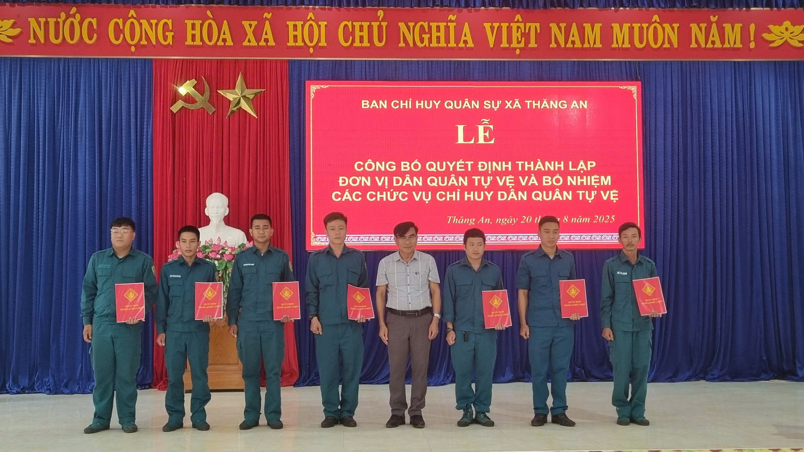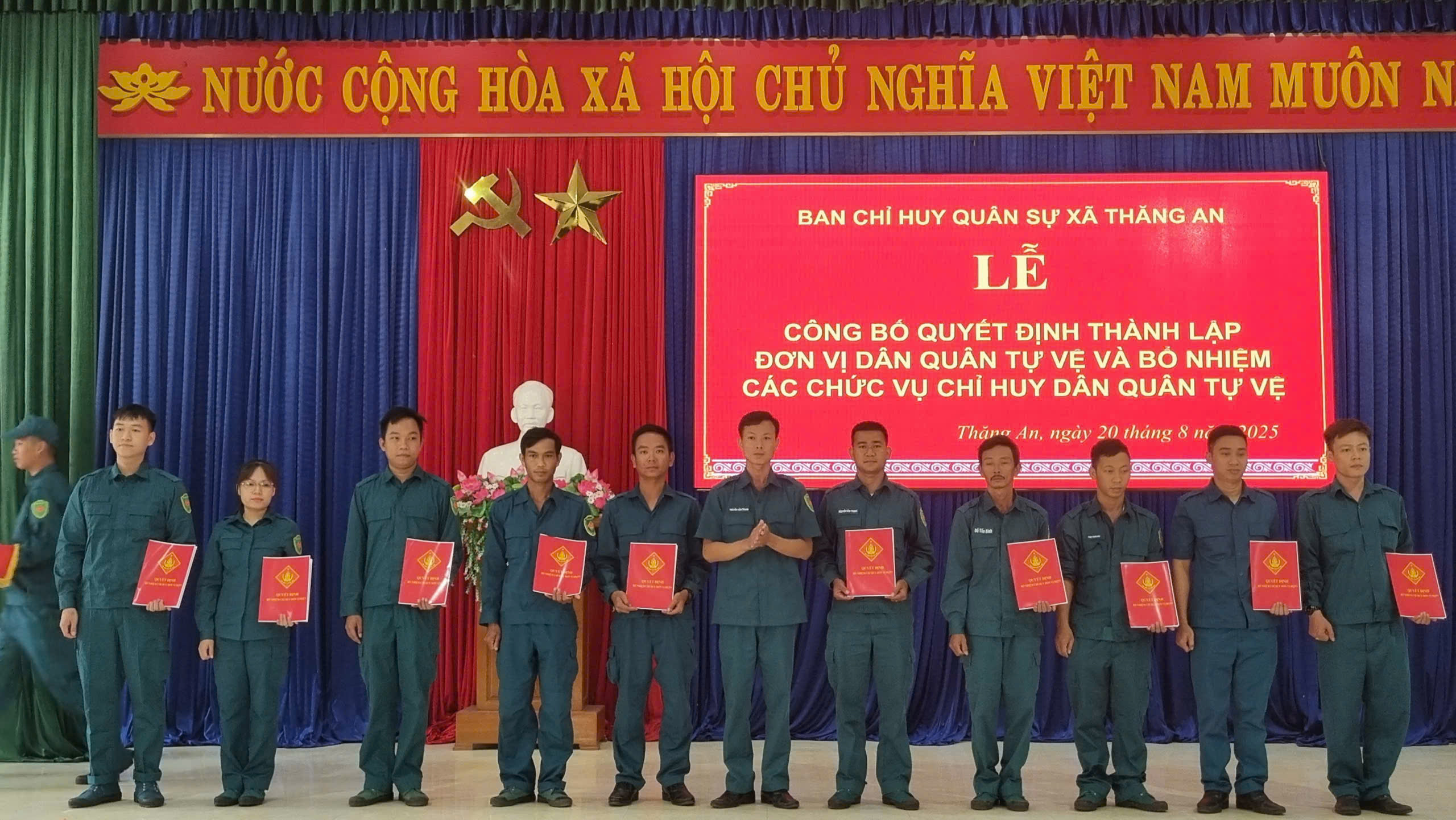 Thành lập, bổ nhiệm các tiểu đội, trung đội dân quân tự vệ là một trong các nhiệm vụ quan trọng khi thực hiện vận hành mô hình chính quyền địa phương 2 cấp tại xã Thăng An. Lực lượng tại chỗ này không cách ly tách rời sản xuất, làm nòng cốt sẵn sàng phối hợp chặt chẽ với các lực lượng tại địa phương trong công tác bảo vệ sản xuất, giữ gìn an ninh trật tự, phòng chống thiên tai, cứu hộ, cứu nạn trên địa bàn xã.