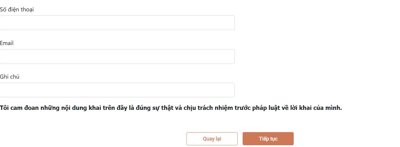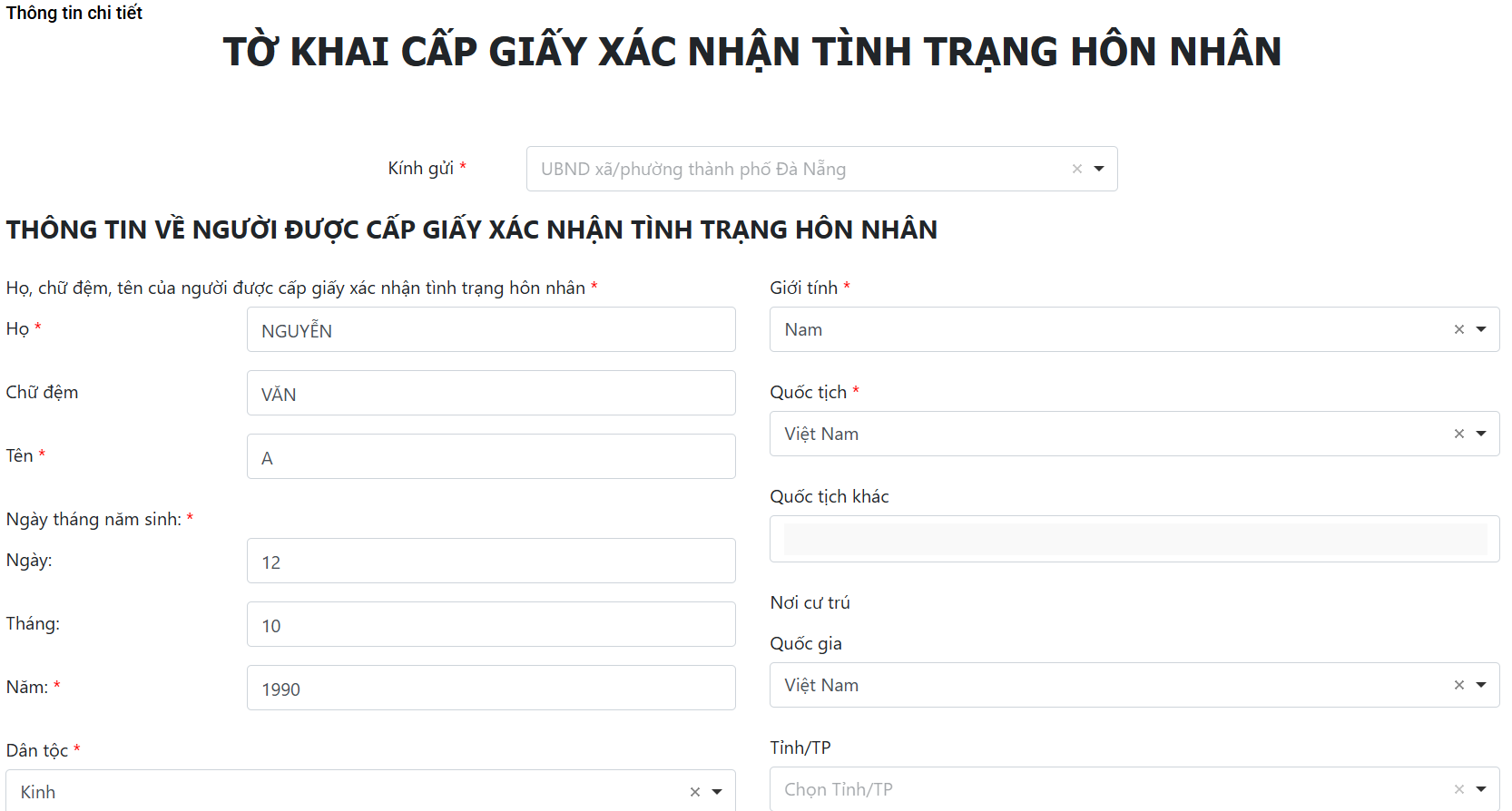 Bước 7: Cập nhật thông tin các trường có đánh dấu (*) của “Tờ khai cấp giấy xác nhận tình trạng hôn nhân” “Thông tin về người đăng ký xác nhận tình trạng hôn nhân” “ Thông tin về người đề nghị xác nhận tình trạng hôn nhân” -> [Tiếp tục]