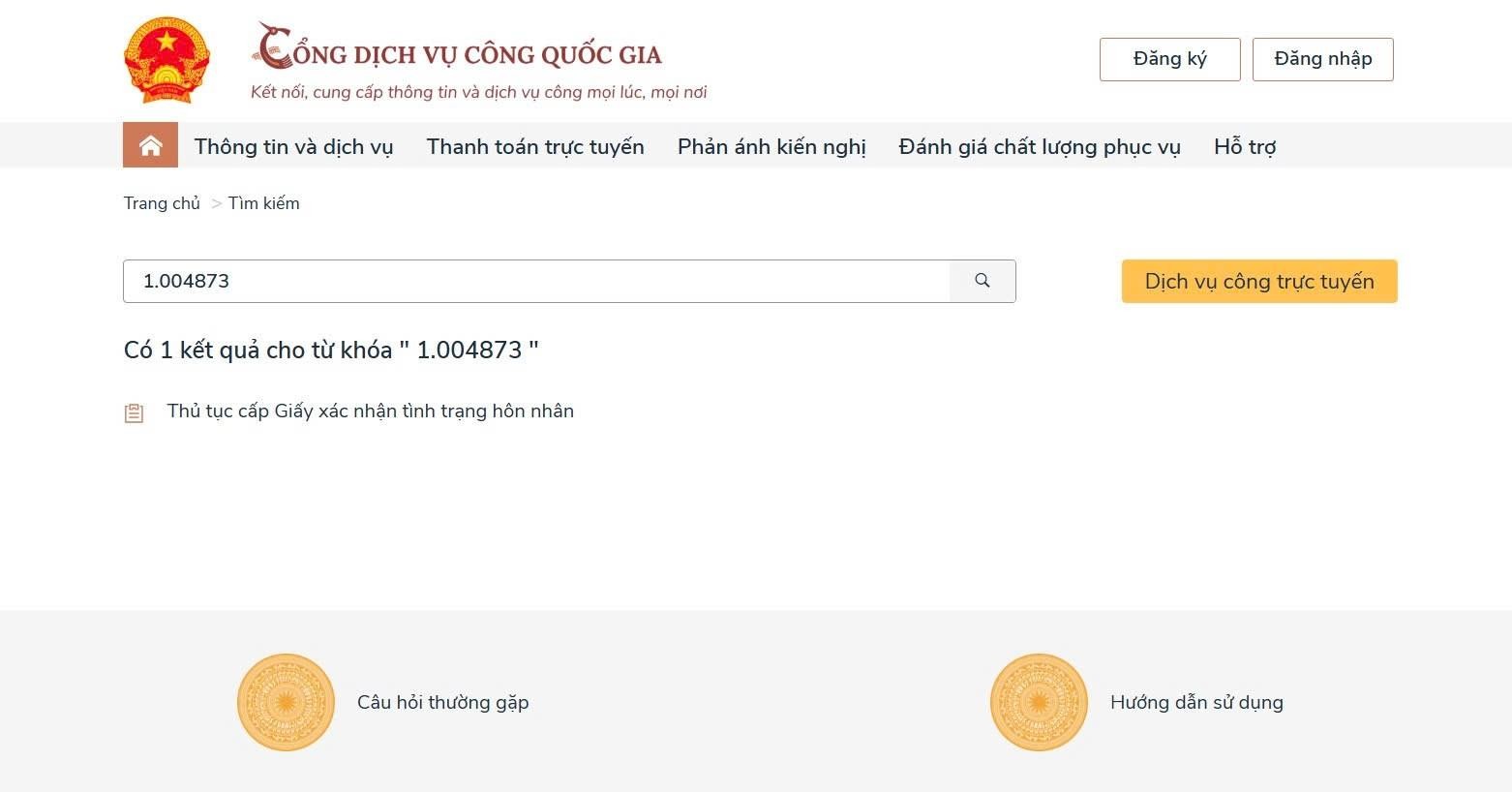 Bước 2: Nhập mã TTHC “1.004873” - Thủ tục cấp Giấy xác nhận tình trạng hôn nhân -> bấm Tìm kiếm