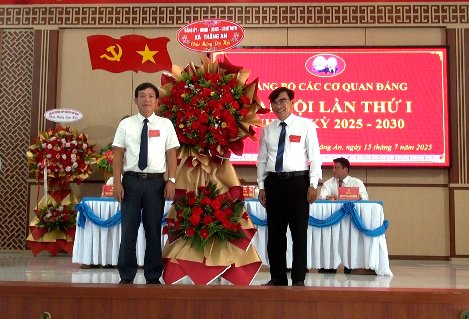 Hình: Đồng chí Ngô Ngọc Hùng - Bí thư Đảng bộ xã Thăng An tặng hoa chúc mừng Đại hội