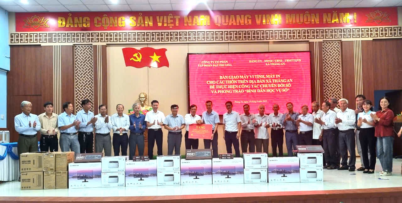 (Ảnh: Công ty Cổ phần tập đoàn Đạt Phương Hội An tài trợ xã Thăng An 18 dàn máy vi tính phục vụ công tác chuyển đổi số tại địa bàn các thôn)