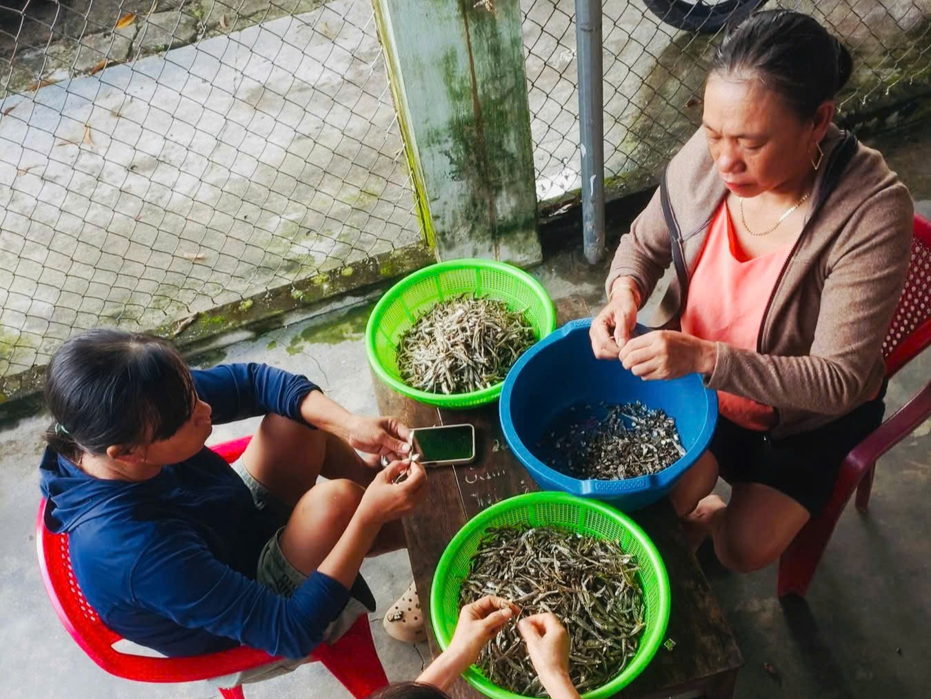 (Ảnh: Chị em phụ nữ thôn Hà Bình, xã Thăng An sơ chế cá khô đóng gói gửi đồng bào miền Bắc)