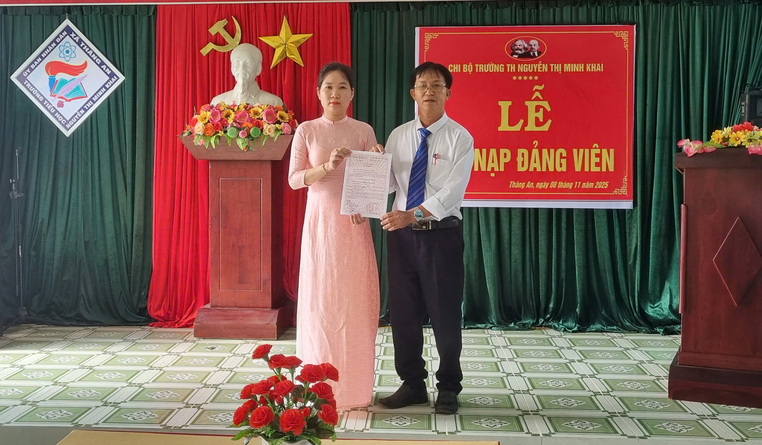 Trước đó, Chi bộ trường Tiểu học Nguyễn Thị Minh Khai cũng đã tổ chức lễ kết nạp Đảng cho đồng chí Nguyễn Thị Tường Vi, giáo viên của trường, nâng tổng số đảng viên đang sinh hoạt tại chi bộ lên 21 đảng viên.