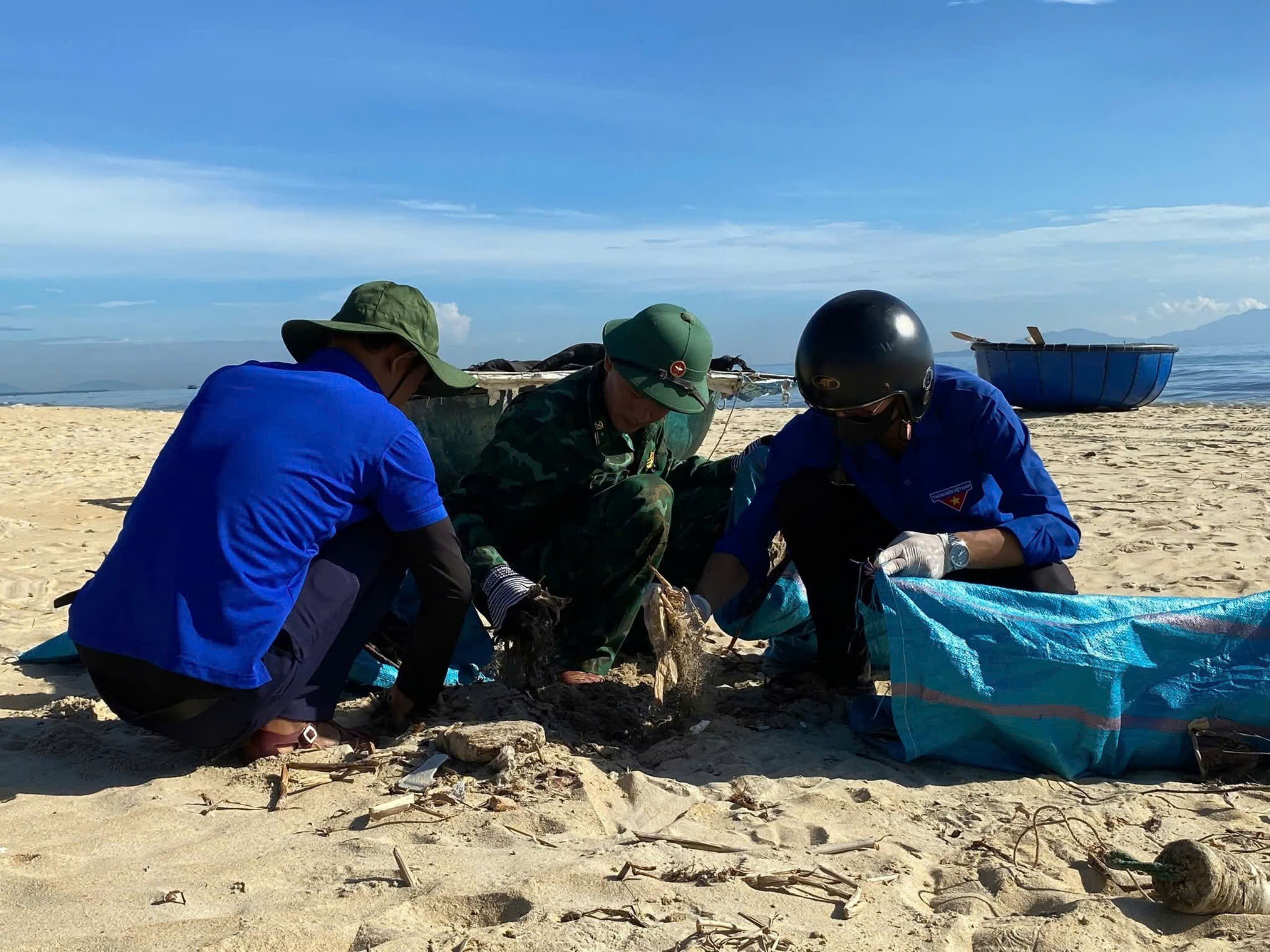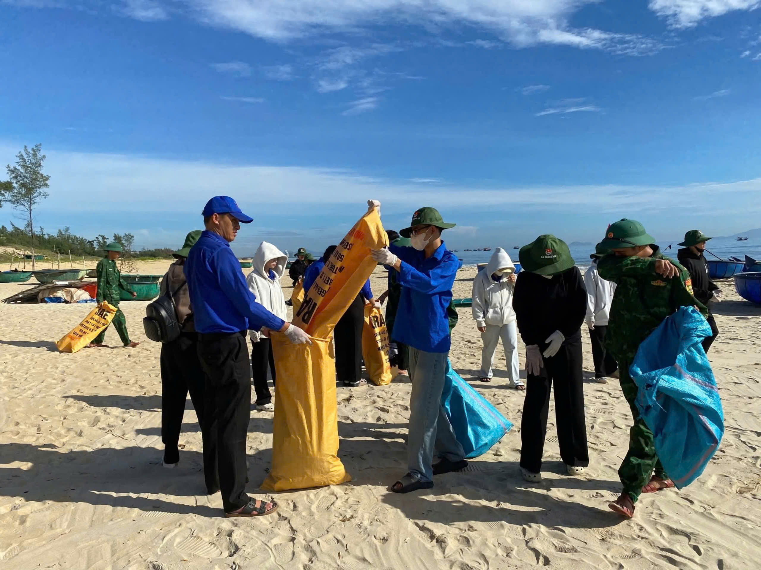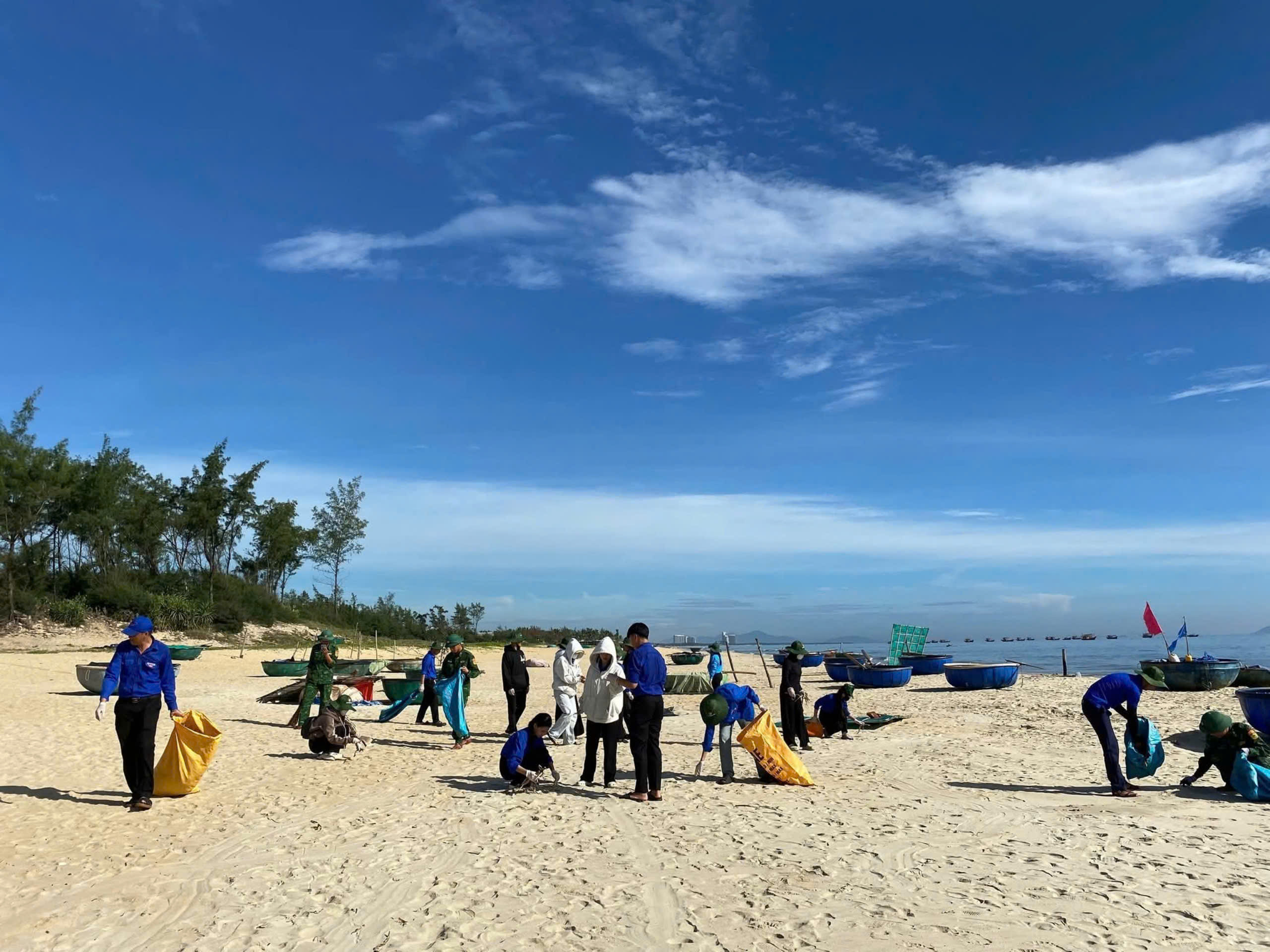 Riêng tại bãi biển tại thôn Hà Bình, Đoàn xã Thăng An phối hợp cùng các chiến sĩ Bộ đội Biên Phòng Bình Minh ra quân dọn vệ sinh các khu vực dọc bãi biển.